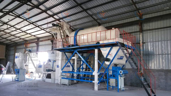 该生产线为双配套生产设备,即砂浆混合及玻化微珠混合。其中,砂浆混合采用卧式无重力搅拌机,混合水泥、沙子、添加剂等,具有混合时间短、均匀度高的优点。无轴滚筒式玻化微珠专用混合机,内部机构设计独特,能保证物料在原始状态下均匀混合,同时将破损率降低。该配套设备是目前生产单组份无机保温砂浆较为科学合理的生产模式。